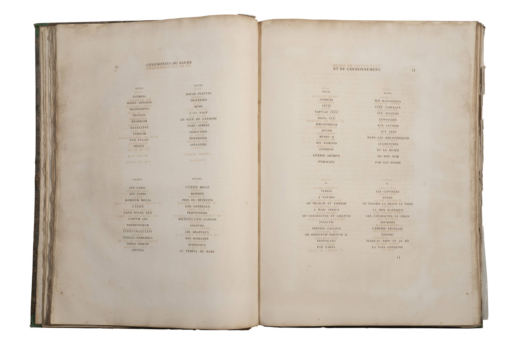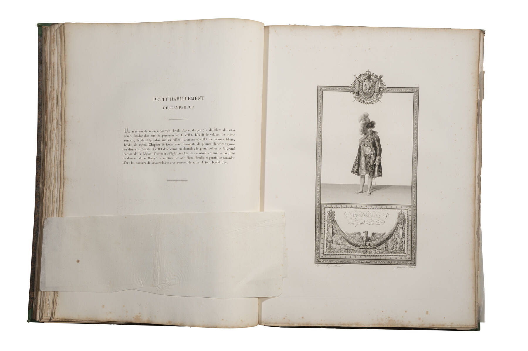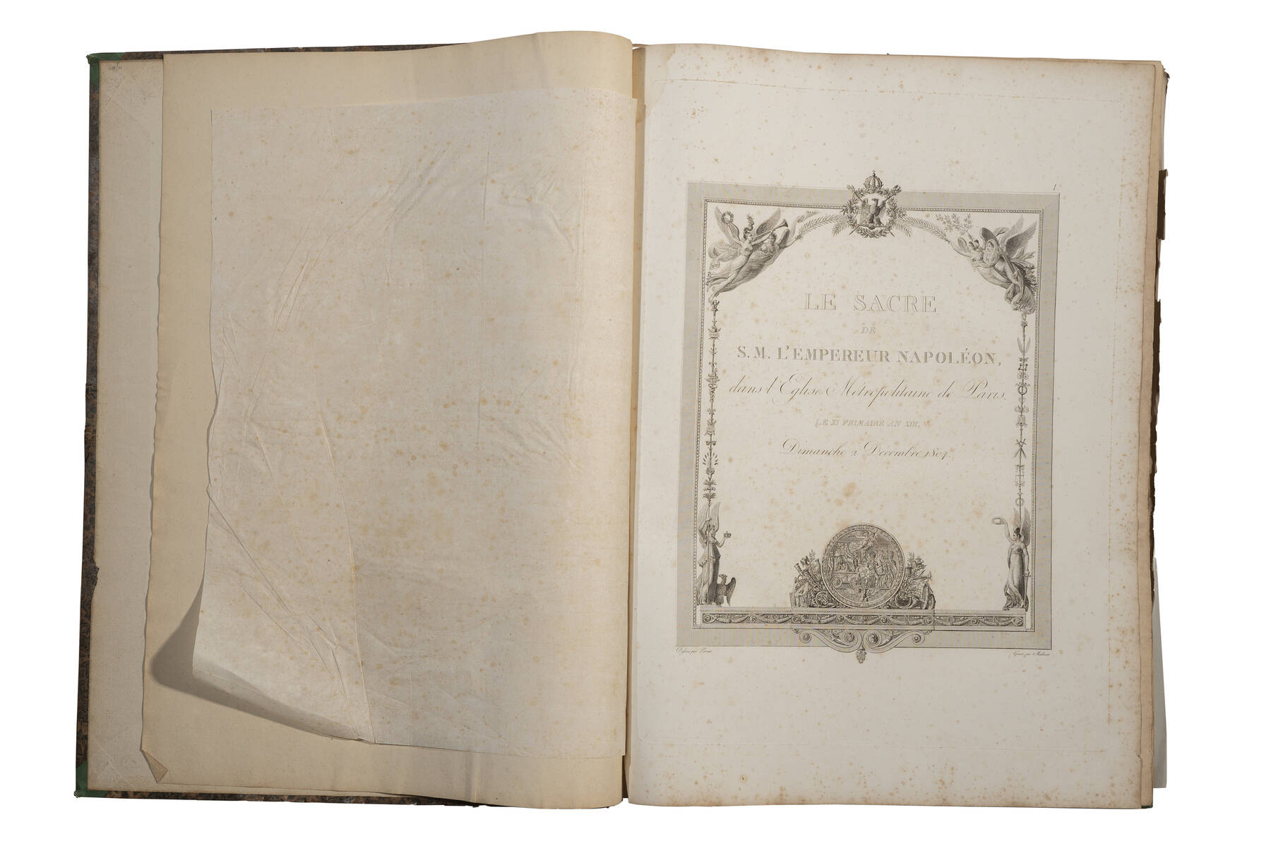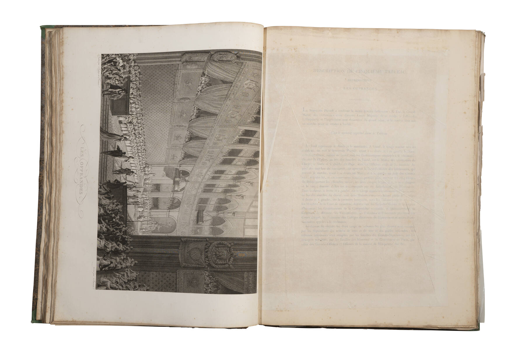 Charles Percier, Pierre-François-Léonard Fontaine, Jean-Baptiste Isabey, Le sacre de S. M. l’Empereur Napoléon dans l’église métropolitaine de Paris, le XI frimaire an XIII dimanche 2 décembre 1804, Paris, Imprimerie impériale, 1804-1815. Grand in-folio de 56-[7] pp., 39 pl. plus 8 pl. volantes. L’une d’elles, datée du 4 mars 1812, est signée de la main d’Isabey en confirmation de la réception d’un paiement.