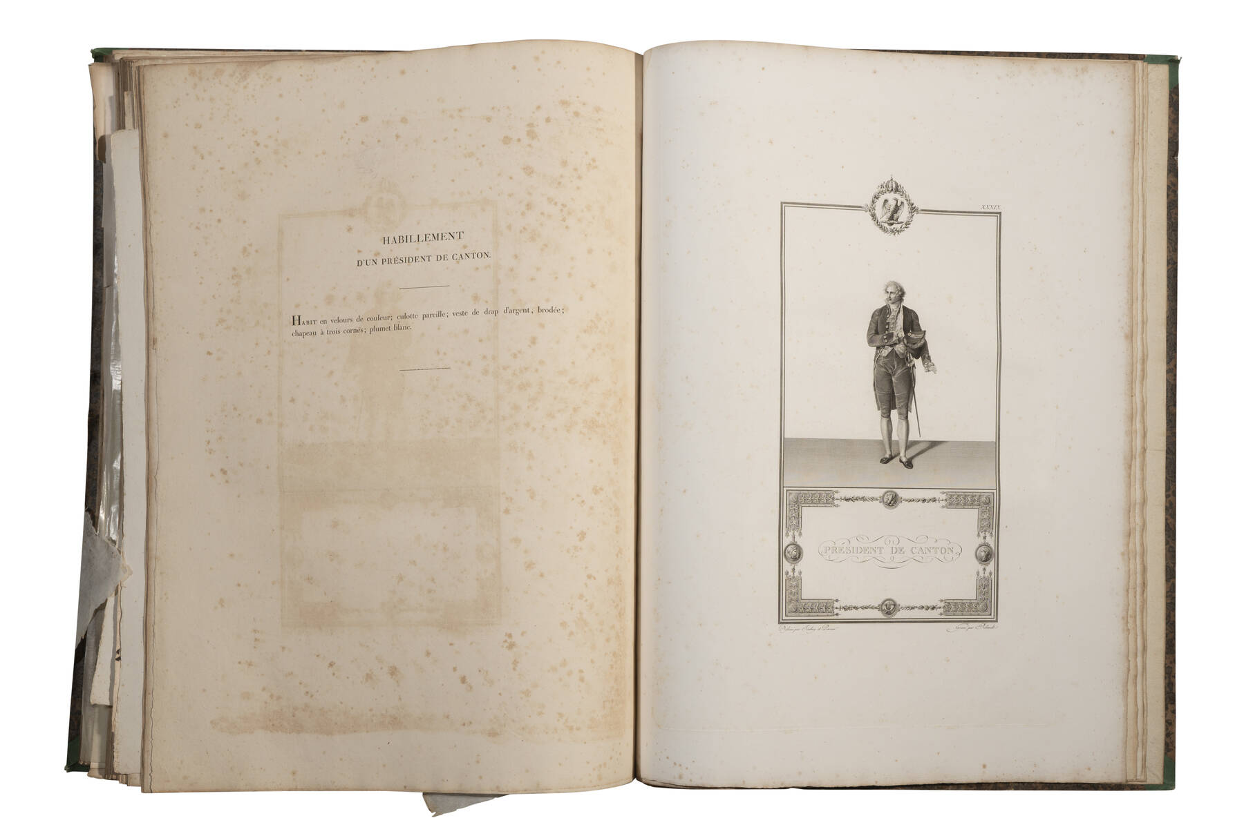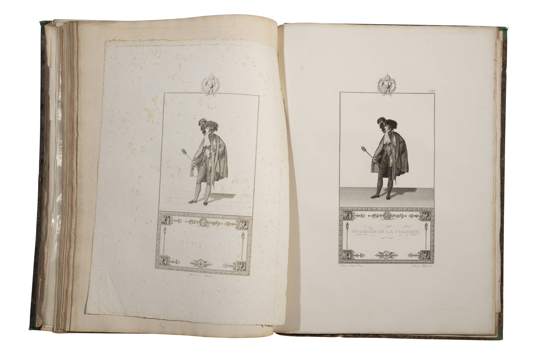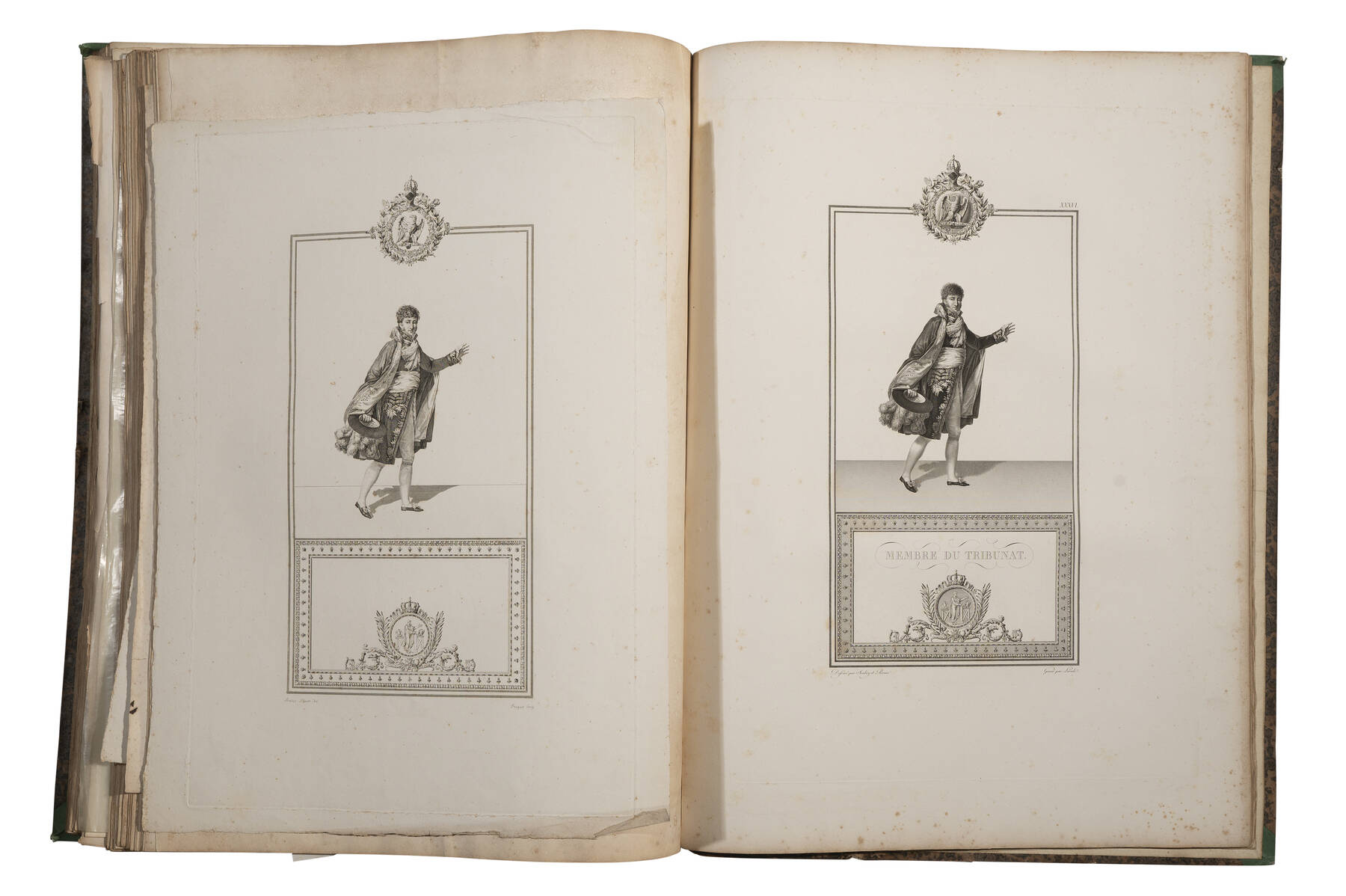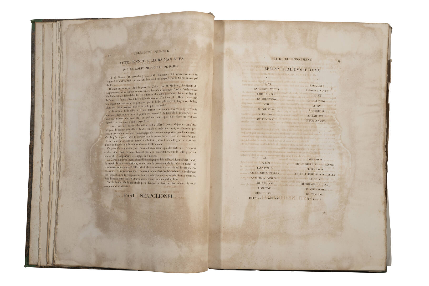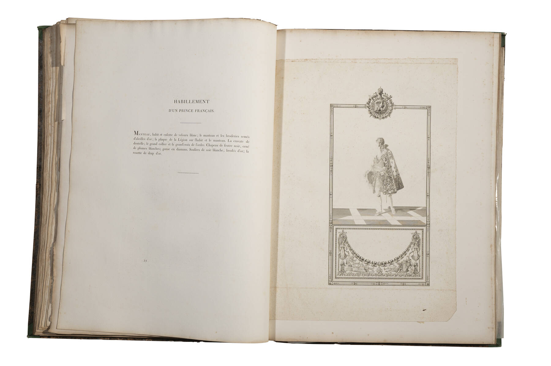 Charles Percier, Pierre-François-Léonard Fontaine, Jean-Baptiste Isabey, Le sacre de S. M. l’Empereur Napoléon dans l’église métropolitaine de Paris, le XI frimaire an XIII dimanche 2 décembre 1804, Paris, Imprimerie impériale, 1804-1815. Grand in-folio de 56-[7] pp., 39 pl. plus 8 pl. volantes. L’une d’elles, datée du 4 mars 1812, est signée de la main d’Isabey en confirmation de la réception d’un paiement.