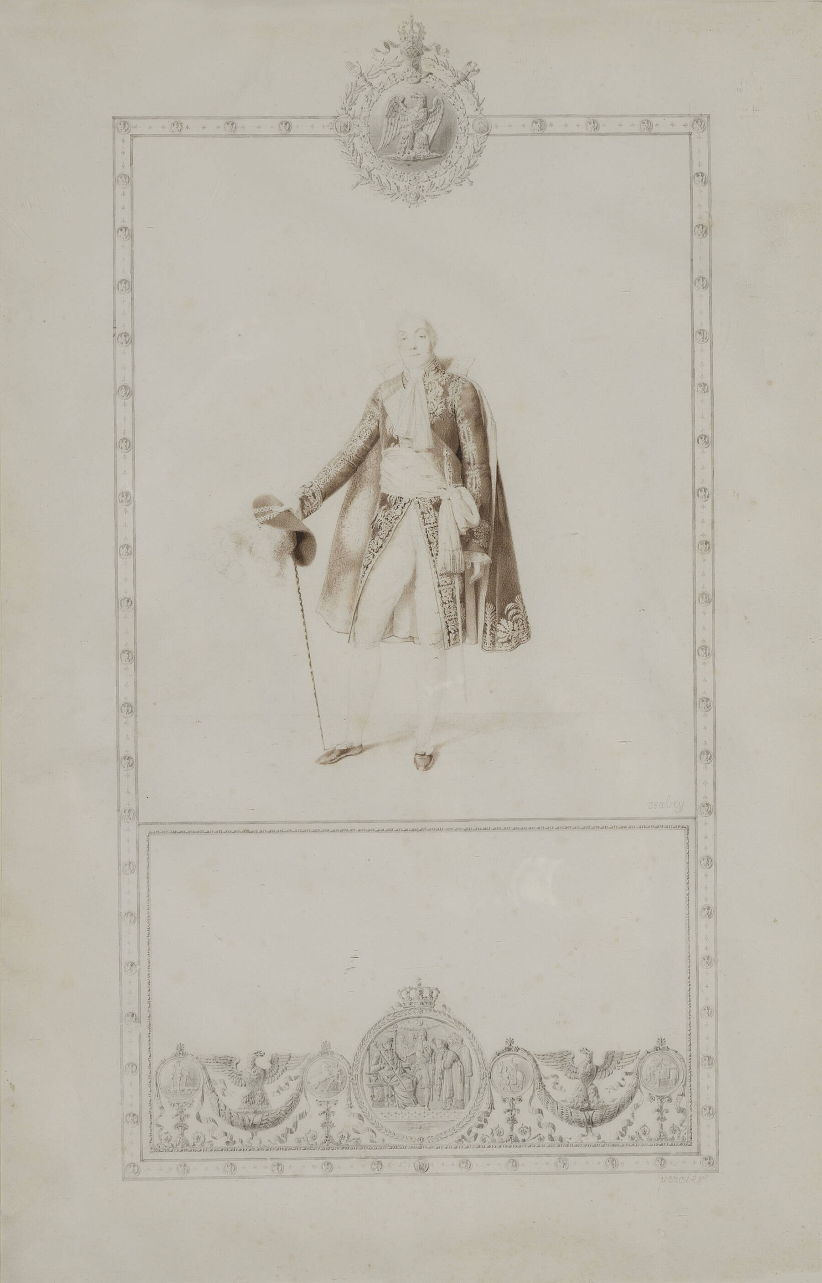 Dessin en rapport avec la planche XX (gravée par Urbain Massard) du livre du Sacre de S. M. l’Empereur Napoléon dans l’église métropolitaine de Paris, le XI frimaire an XIII dimanche 2 décembre 1804, destinée à illustrer l’« habillement d’un Grand-Officier de la Couronne ».